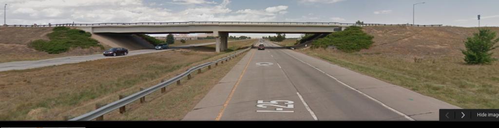 Here's the south side of the overpass at East Harmony Rd., not far from where Cory Romero was wounded. (We aren't sure of this location either, but the alternative Hwy 14 area offers even less cover).