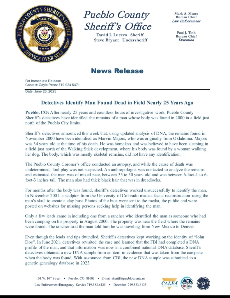 ''The Pueblo County Sheriff’s Office (PCSO) along with the Colorado Bureau of Investigation worked with Othram, a forensic DNA Lab in Texas, to identify the remains of 34-year-old Marvin Majors on Monday.