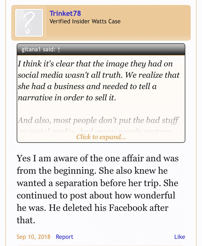 “Yes I am aware of the one affair and was from the beginning. She also knew he wanted a separation before her trip. She continued to post about how wonderful he was. He deleted his Facebook after that.”