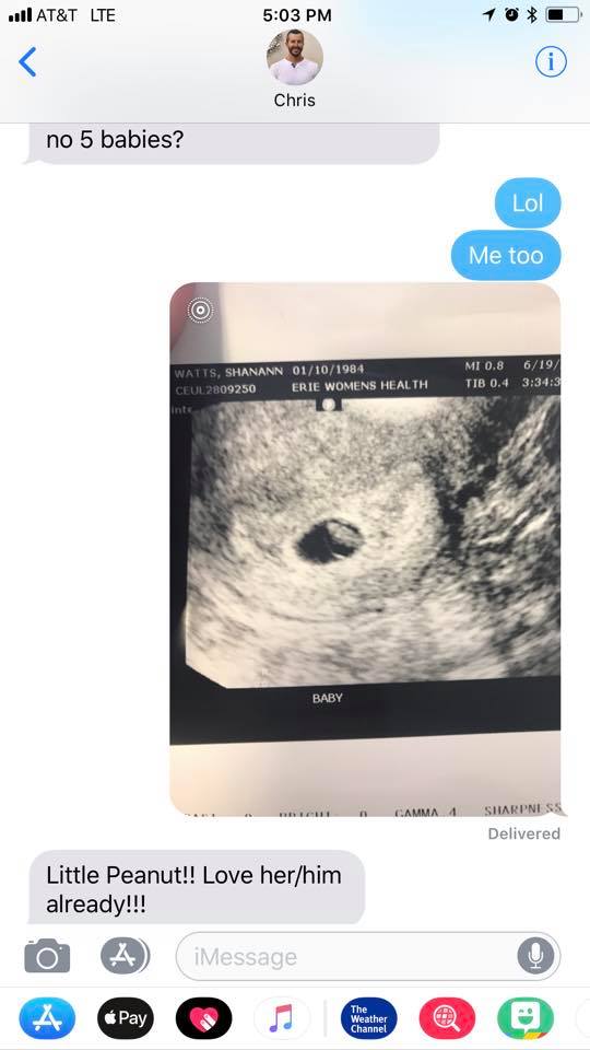 On June 19, she posted a screenshot of their texts after she sent him a photo of her ultrasound; he replied that he loved the little peanut already.