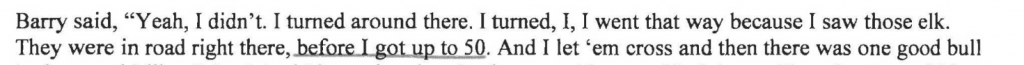 We have not got it confirmed yet which washed out road BM was referring to. However, I read it to mean that BM is saying he spotted the elk as he drove up 225 and he was approaching the intersection with 50. The elk crossed 50 from the south side to the north side off to his left. BM says he let them cross then turned left on 50 so he could watch them a little longer and get a good look at the bull elk. The herd turned up the washed out road about 500 ft from the intersection. Of course we all know there were no elk. BM made up the story to explain why he turned left, (west), on 50 towards Monarch as opposed turning right, (east), which was the route he would take to go to Broomfield.