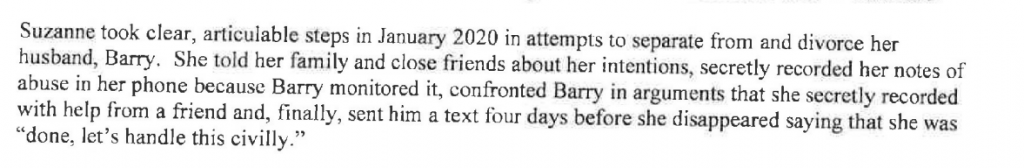 Yes, Suzanne expressed her unhappiness to her friends, and maybe took steps to gather evidence and document so-called "abuse" by Barry in her phone as the AA states, but why she would do this if Barry indeed "monitored" her phone. It doesn't make sense.