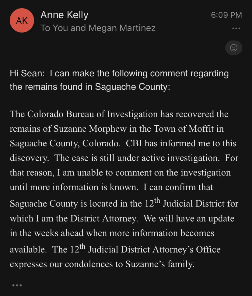Anne Kelly is a badass. I know her personally from my domestic violence work. She was previously a senior prosecutor in Boulder County with a solid record. I am a hardcore Dem and she's an R and I donated to her reelection campaign. Yes, in these divided times. She has excellent domestic violence experience and is just as intelligent, logical, and grounded as can be. And she has a passion for victims.Lots of questions surrounding which district attorney’s office will pursue a potential criminal case after Suzanne Morphew’s remains were found. Here’s a statement from 12th Judicial District Attorney Anne Kelly, who represents Saguache County.