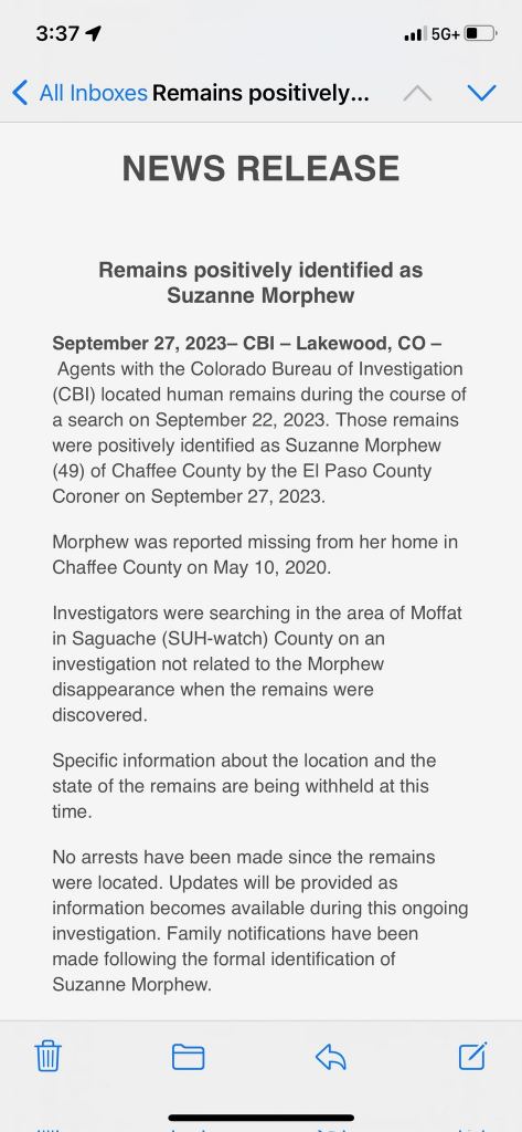 Found Deceased CO - Suzanne Morphew, 49, Chaffee Co, 10 May 2020 *Case dismissed w/o prejudice* #107