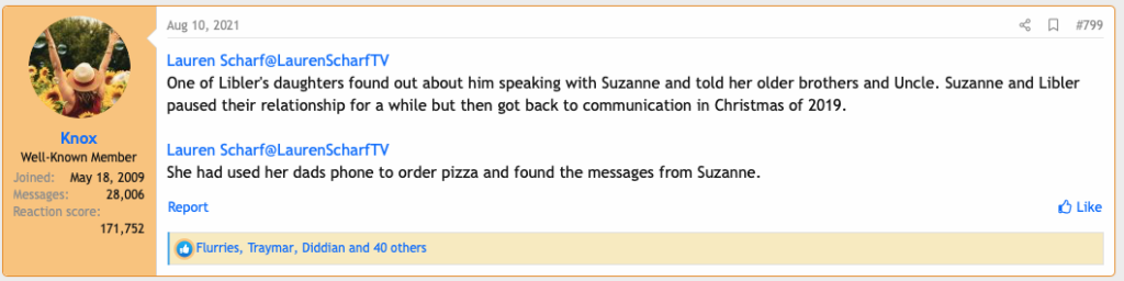 Because he knew her identity and IMO so did his daughter. He deleted all SM and reading between the lines (e.g. her message to him on linked in), he cut all contact. You wouldn't do that if it was just a 'friend' and his daughter knew it. Teens are very savvy on tracking people down. JL at the very least, should have come forward, as soon as he realised it was his suzanne that was missing.Why is OP so certain JL's daughter and family knew the identity of SM -- there are millions of Suzanne's. Again, no basis for this wishful incrimination and condemnation of a family.