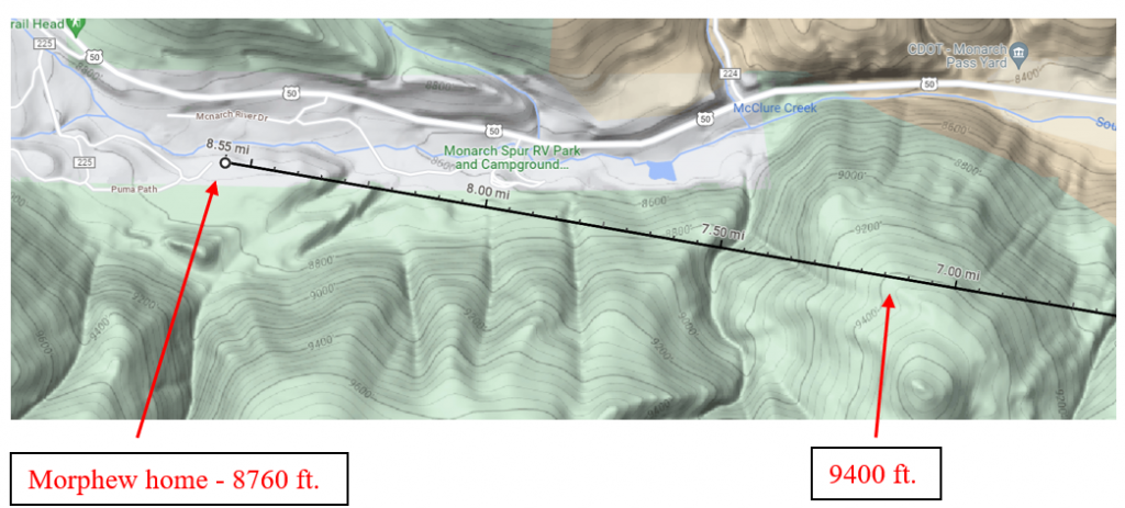 GPS, like the signal to a cell tower, requires line of sight (LOS) for the best accuracy. GPS reliability will be compromised by the fact that the area of the Morphew home, helmet dump and last ping are in a narrow canyon (unless satellite is directly overhead it is unlikely to have LOS). However, as shown in the figure, there is direct line of sight between the Poncha Tower and the last ping of Suzanne’s phone. The elevation of the last ping is about 9600 feet, and the highest intervening land elevation is only 9400.