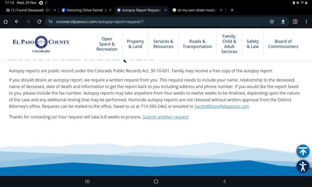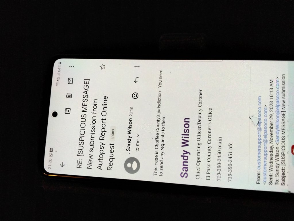 I figured as much and expect you'll next receive a response from Chaffee County that pursuant to a CORA exception, the report is not available because the victim is part of an ongoing investigation where there's been no ruling on the cause/manner of death as of yet.