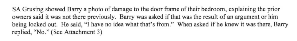 Maybe wood fragments came from the original bedroom door. And the broken one was replaced in its secondary location at his earliest opportunity. If down the road, neighbors would never be any the wiser, and Barry probably had free entry, neighborly to check in on the place.