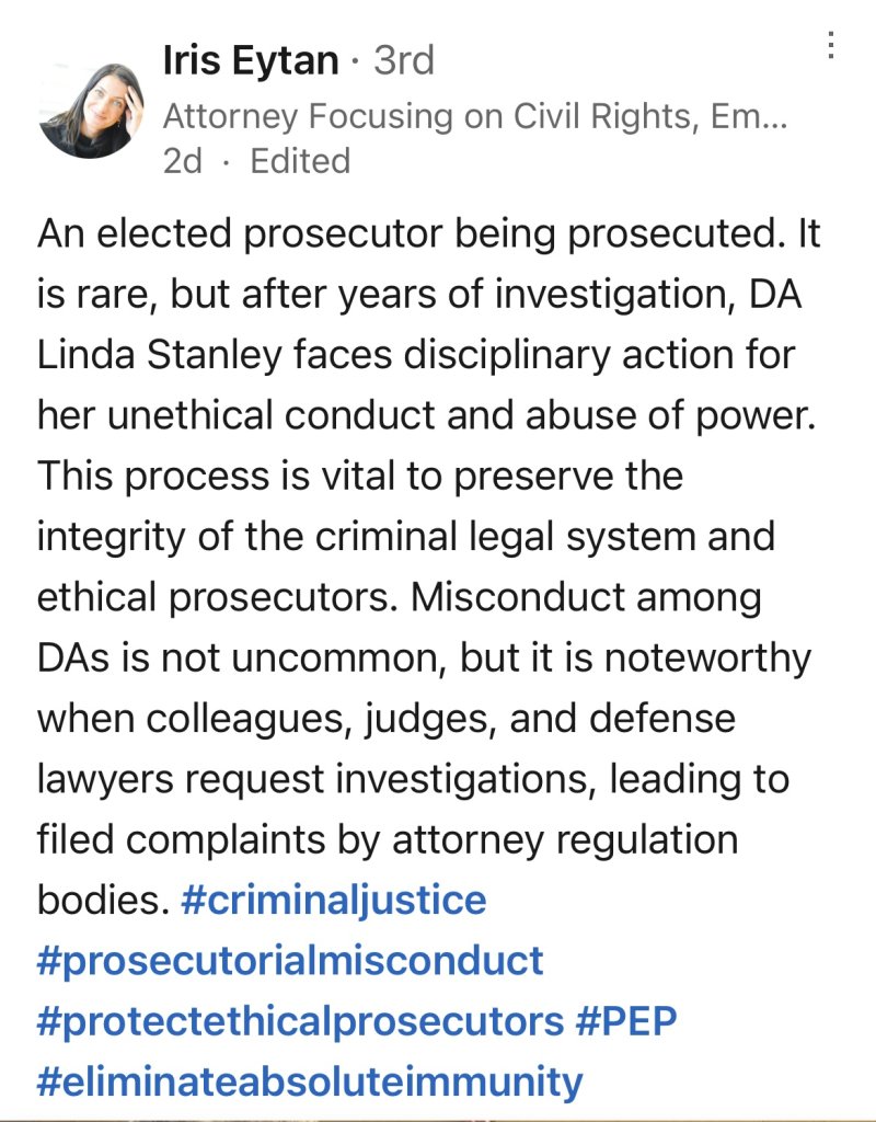 Yes, how rich of IE to omit that she personally urged the OARC to disbar, if not severely discipline all 8 prosecutors that ever worked on this case, and that she's also suing more than 20 others for $15M!