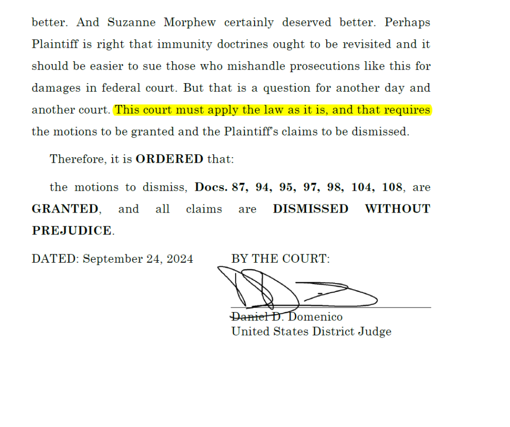 The $15M arrogance by this team! Who could possible doubt probable cause did not exist, or that prosecuting BM was unlawful? And thank you Judge Domenico for not delaying the ruling on the defendants Motions to Dismiss.