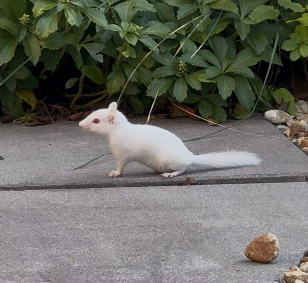 I think you seeing that little guy is a good omen. White squirrels and chipmunks are a symbol of good luck and symbolize the coming of change.