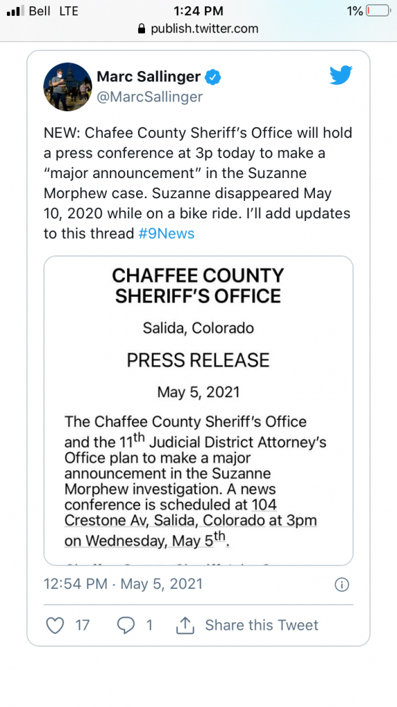 "The Chaffee County Sheriff's Office said it will hold a press conference on an update in the Morphew case at 3 p.m. today. Denver7 will stream it live."