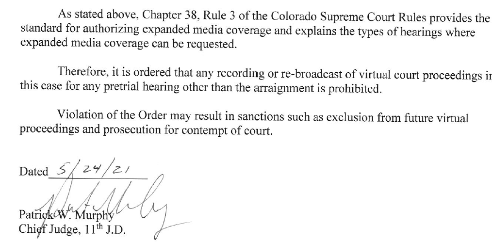 https://www.courts.state.co.us/userfiles/file/Court_Probation/11th_Judicial_District/Chaffee/cases of interest/21CR78/21CR78 Morphew Order Expanded Media.pdf
