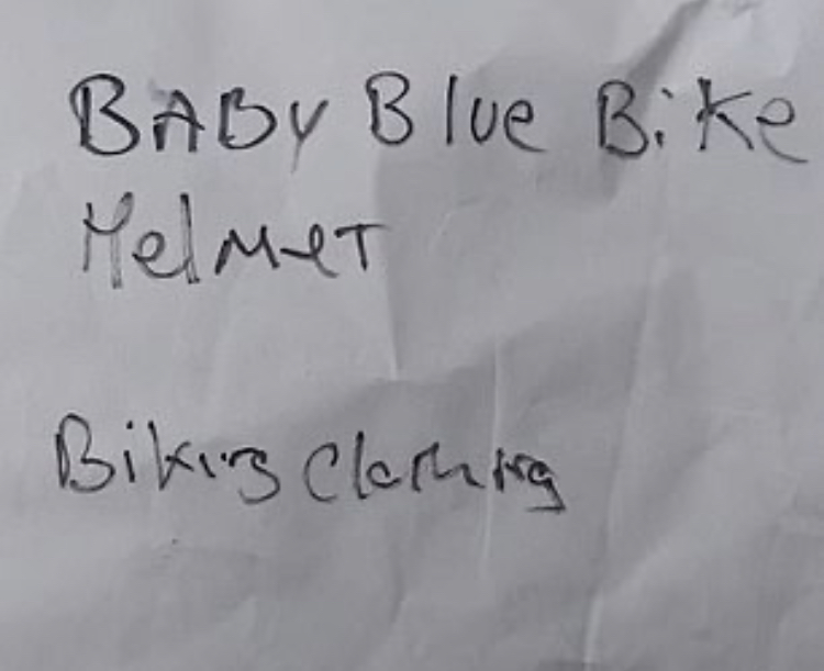 Remember his very detailed note he left at the market that when she went missing she had a baby blue helmet and biking clothing. JMO