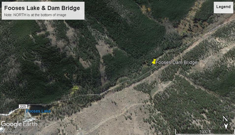 This is a screenshot from Google Earth, which is just a higher version of the same aerial view in the previous post. The Colorado Trail is still clearly labeled by Google Earth in the upper right. I have dropped a yellow pin at the bridge, which requires drastic closeup to see clearly in GE.