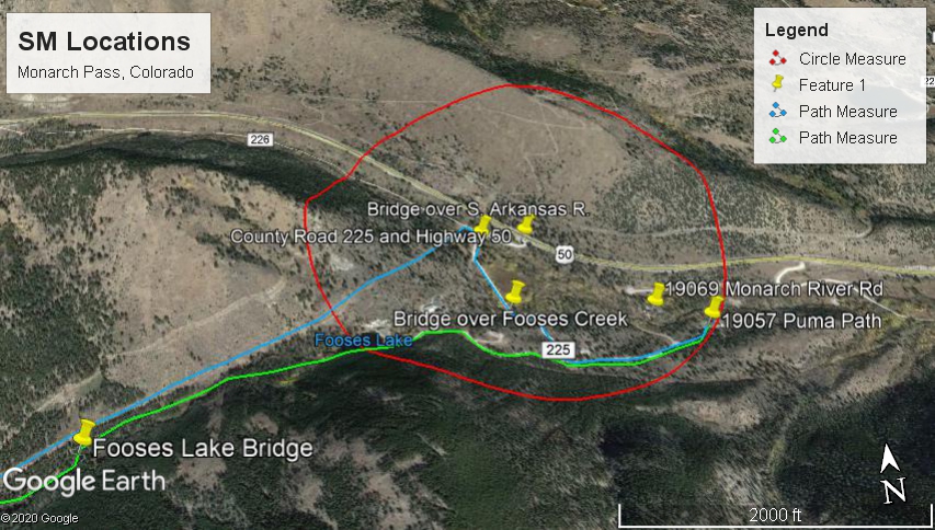 This post is an attempt to make sense of the various tidbits of information that have made mainstream news reports. Please don’t expect me to prove ANY of the MSM reports as I’m not confident in their veracity myself. All I’m trying to do is plot the information onto a map as a line of events, instead of random bursts of disconnected info. The illustration is a Google Earth Aerial View of the area, with SM’s house at 19057 Puma Path marked by a yellow pin on the extreme right. It is reported that she left about 8:00 am, proceeding toward the vicinity of the intersection of Highway 50 and County Road 225. Her neighbor JR saw her ride by her house, which is marked by another yellow pin at 19069 Monarch River Rd. I have ,marked the route in light blue line following SM’s driveway, Puma Path, and County Road 225. Just past the bridge over the South Arkansas River, marked with a yellow pin, CR 225 veers right, to rise to join Highway 50, but I have veered SM’s possible route left, following the path of service crews on the massive power line. Once the clear cut is joined, the elevation is precisely 8,850 ft. I can see how she may have planned an all-day outing, involving riding / walking all the way up the clear cut to the top, at 11,400 ft. There is a well worn path, and the exact elevation rise might be convenient for exercise calculating. I can only guess at that part because you will never see me doing this run. I’ve cut off the majority of the ascent, to keep the aerial view in reasonable perspective. But imagine that blue line going all the way up. On top, there are paths across the ridge (literally ridge at the top of Monarch) to a permanent sign marking the Fooses Lake descent. I’ve picked up the path with a neon green line near the point where I cut off on the left side of the picture. It descends rapidly to the Fooses Lake Bridge (marked with another pin), which appears to actually be a way up the canyon from Fooses Lake. Note that path path down only crosses the path up in one spot. It doesn’t cross in the hidden portion of the paths, either. That single crossing is in an open flat, severely limiting the possibility of fast moving descending bikers slamming into slow moving ascending bikers. Once past Foos Lake, SM’s path would have been on County Road 225, crossing the bridge over Fooses Creek marked with a yellow pin, and retracing her route up Puma Path and her driveway to home. Obviously, she never made it home.
