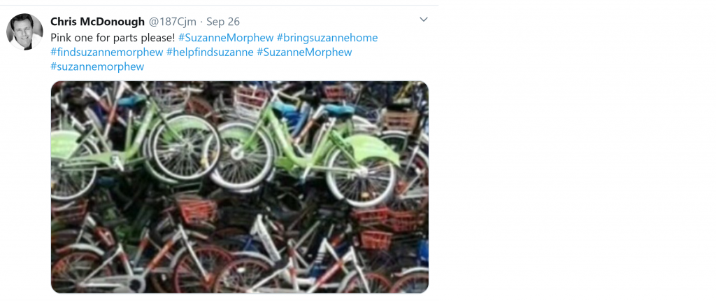 The bike was placed upside down against a tree. BM via TN begged the public to ask LE what shape the bike was found in, which was very strange. LE would not disclose that information, or even that the bike was found.