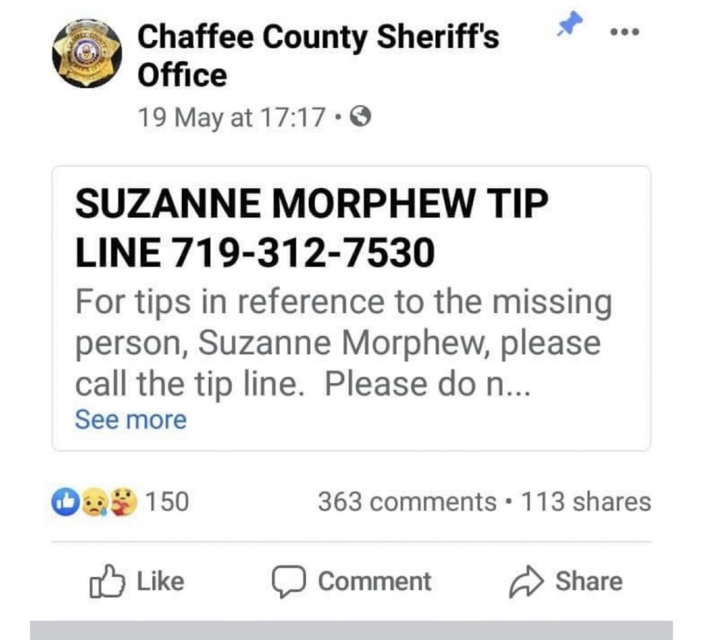 Looks like Chaffee County Sheriff’s Office re-pinned #suzannemorphew tip line and info to the top of their Facebook page again. Glad to see that they got my email and likely others about why they would take it down. #justice4Suzanne #FindSuzanne #BringSuzannehome