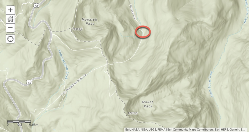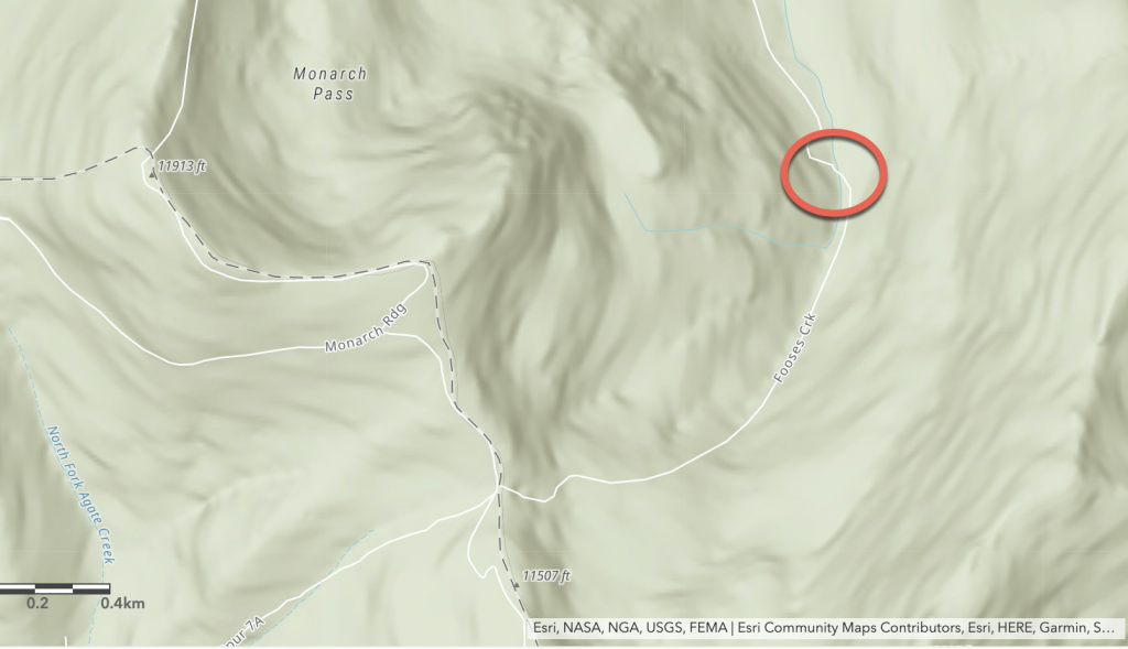 The Colorado Trail, which goes up to Monarch Pass Trailhead, follows South Fooses Creek, and crosses over North Fooses Creek again fairly close to the top, near the trailhead.