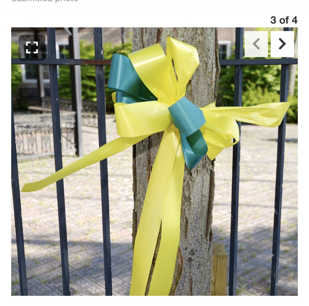 news report from her hometown, yellow/teal ribbons are being placed throughout town.