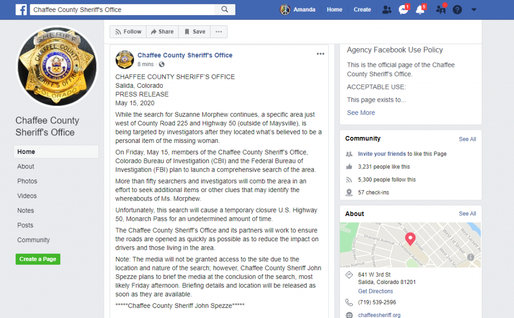 On Friday, May 15, members of the Chaffee County Sheriff’s Office, Colorado Bureau of Investigation (CBI) and the Federal Bureau of Investigation (FBI) plan to launch a comprehensive search of the area.