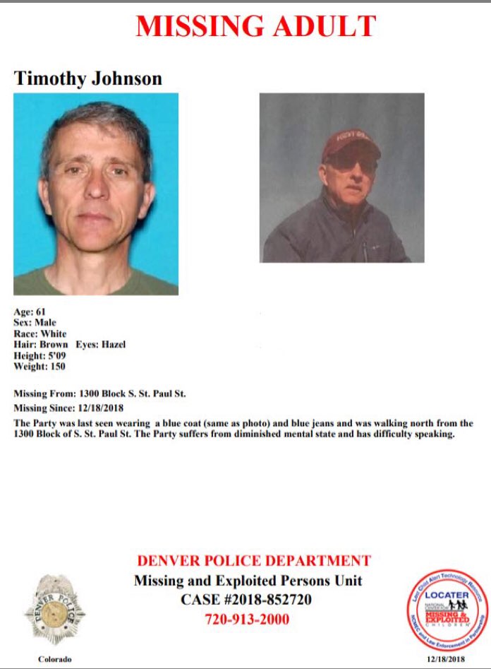 Timothy Johnson, 61, was last seen walking north in the 1300 block of South St. Paul Street in the Cory-Merill neighborhood. Johnson has difficulty speaking, according to Denver police.