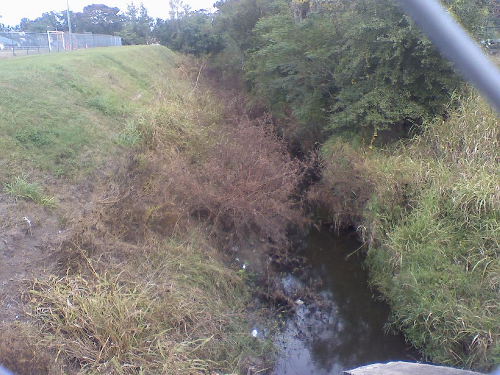 Driving in, just behind the church and before the parking lot I drove over the Econ river (skinny section I guess) big ravine with pipes this is pic of North side/right. About a 5 foot fence but just to my left the fence is cut and pulled back. I could have just walked in - wisely chose not to!!