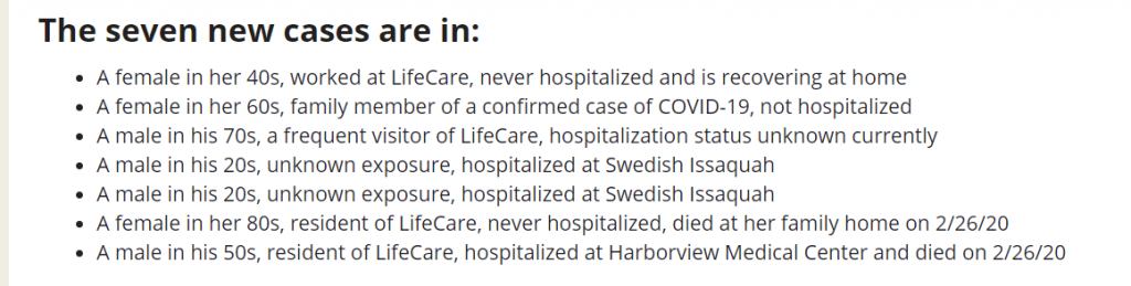 Among the 7 new cases in King County, Washington are a person who worked at the nursing home, a "frequent visitor" to the nursing home, and 2 residents of the nursing home (who both died) Steve Lookner on Twitter