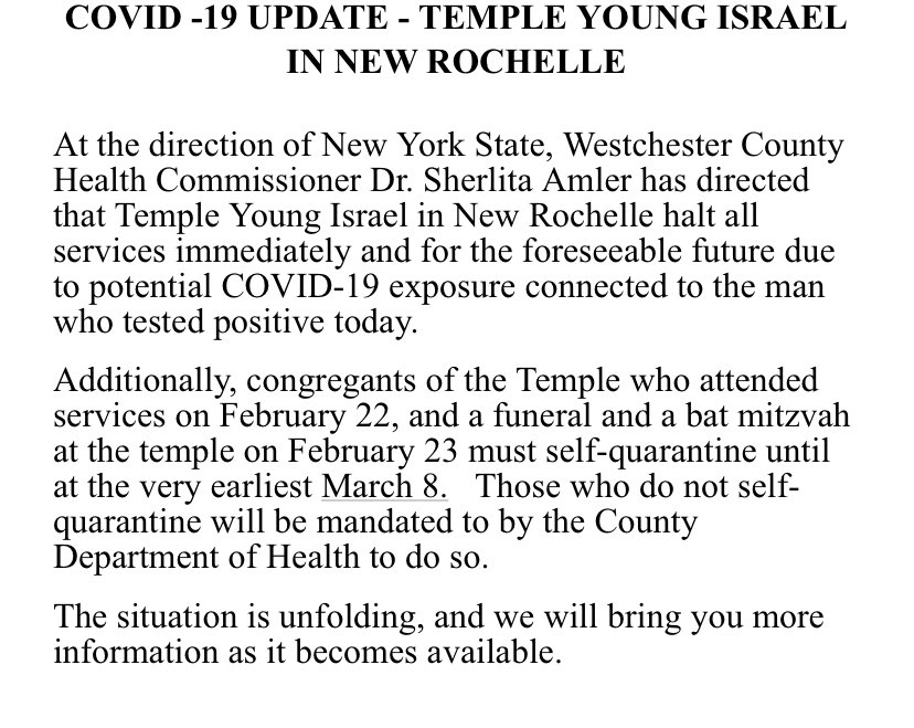 BREAKING - New Rochelle synagogue ordered to halt services and approx 600 people told ordered to quarantine due to potential #COVID19 #NovelCoronavirus exposure. Tony Aiello on Twitter