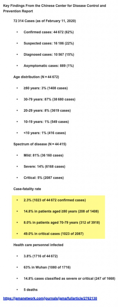 Here are some points to consider. The first image is the age demographics for people over 70. The second image is the fatality rates in China on Feb 11. There's no reason to think that the fatality rates will be different in China as compared to other countries.