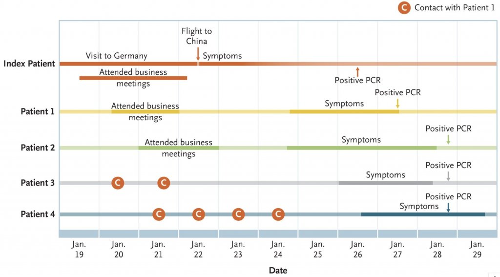 At the base of this lineage lies the sample Germany/BavPat1/2020. This was "patient 1" in Bavaria who was infected by a business colleague visiting from China. This cluster was investigated via contact tracing and an analysis written here: https://t.co/HgUF9BIzc6 4/7 Trevor Bedford on Twitter