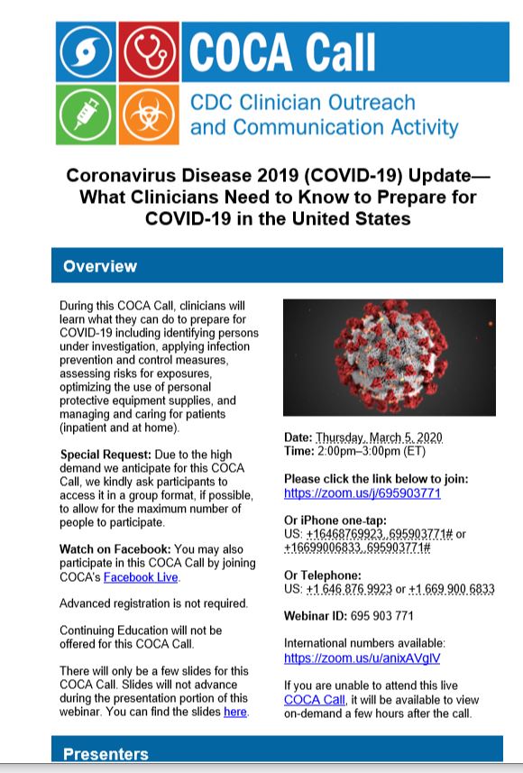 Today is a 2-3 pm call for health care professionals in the US by the CDC Clinician Outreach and Communications Activity. The live feed (audio only is assumed) can be listened to live at CDC site of CDC Clinician Outreach and Communication Activity - COCA