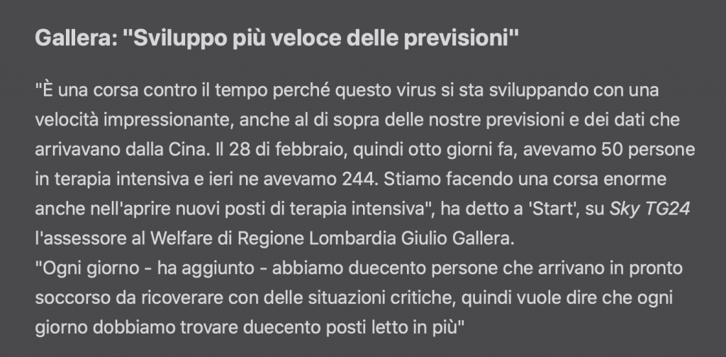 18/ Lombardy's welfare minister: "every day we get 200 new people to the ER in critical conditions, which means every day we need to find 200 more hospital beds. […] the virus is spreading at an exceptional speed, faster than our predictions and than the data we got from China." Luca Dellanna on Twitter