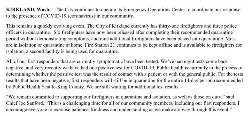 1 first responder in Kirkland has tested positive for coronavirus. Some others are awaiting results. Mike Baker on Twitter