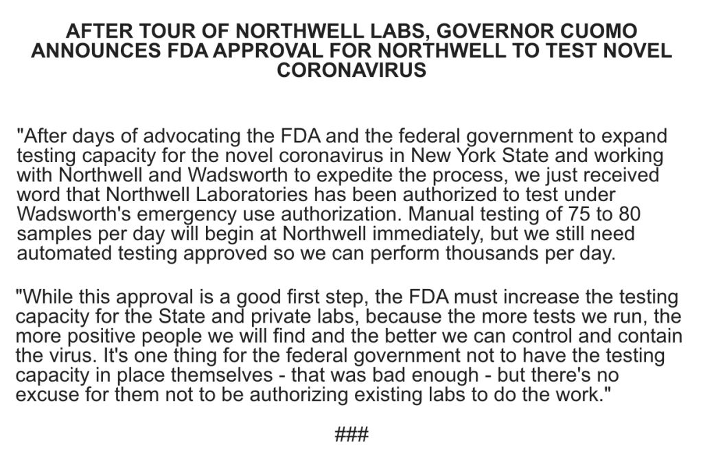 After days of advocating the federal gov't to expand #Coronavirus testing capacity, we just received word that Northwell Laboratories has been authorized to test.