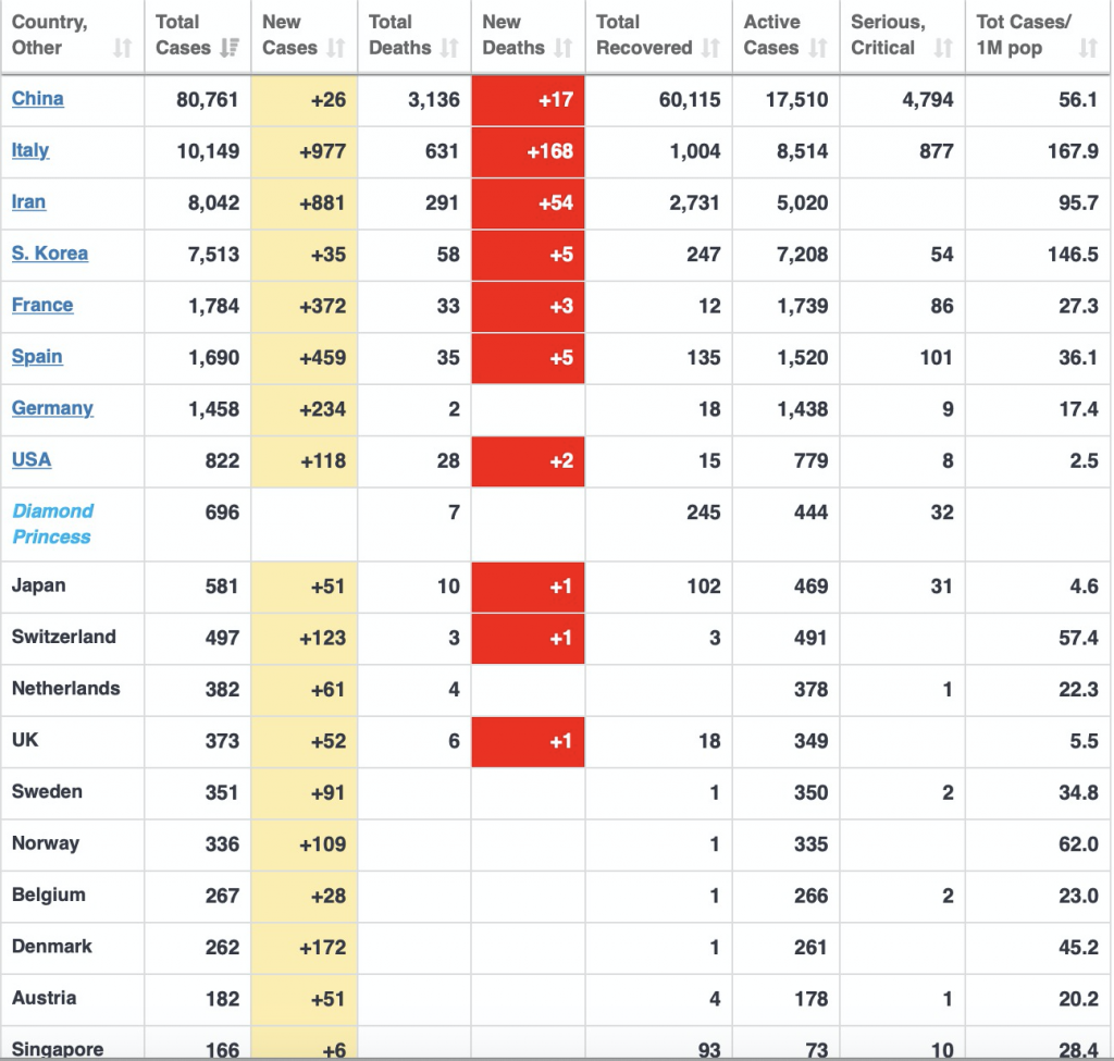 1. Mainland China: 80,754 cases; 3,136 deaths