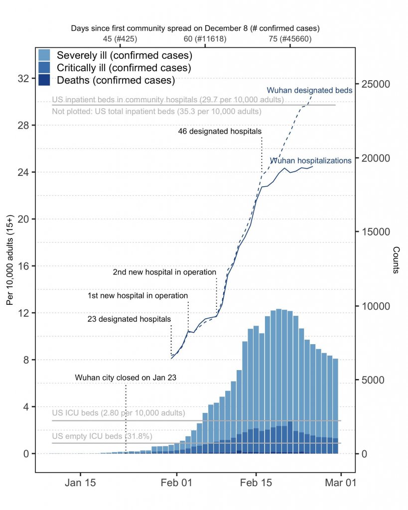 We looked at the epidemics in Wuhan and Guangzho and their ICU and hospital bed use vs US capacity. Summary: Wuhan's peak critical case load per capita was equal to the total number of ICU beds per capita in the US -- a similar experience to Wuhan would fill our ICU with COVID.