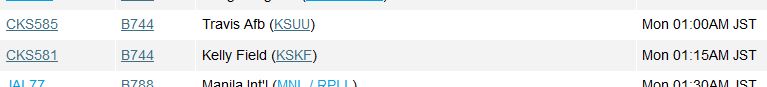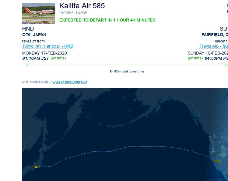 The two US planes are scheduled to depart within 30 minutes with evacuees from the Princess cruise ship. It is 12:39 local time there, and the two US flights (585 to Travis AFB between San Fran and Sacramento, and 581 to Kelly Field/Lackland AFB outside San Antonio TX) are leaving at 1:00 am and 1:15 am.