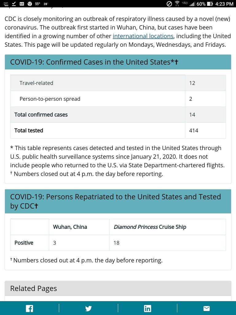 MOO...........attached is the CDC reporting table that they discussed on the call yesterday. 414 have been tested and we know there are over 8,000 people that were asked to self isolate after returning from China.