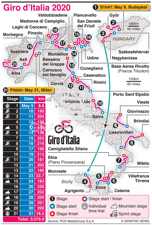May 9, 2020 - May 31, 2020 - The 102nd edition of the Giro d’Italia kicks off in the Hungarian capital, Budapest, and includes three individual time trials, with the final test against the clock coming on the last day in Milan