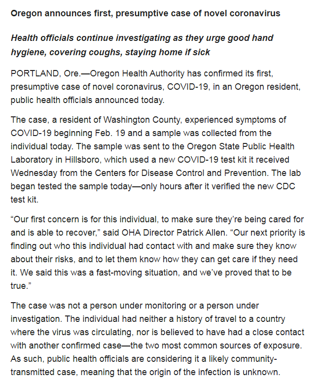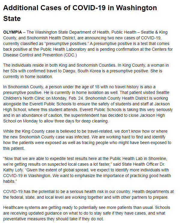 Press release from Washington state on 2 new cases of coronavirus. One of them was locally acquired, the other one is linked to South Korea. BNO Newsroom on Twitter