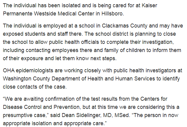 “In Snohomish County, a person under the age of 18 with no travel history is also a presumptive positive. He is currently in home isolation as well. That patient visited Seattle Children’s North Clinic on Monday, Feb. 24. Snohomish County Health District is working alongside the Everett Public Schools to ensure the safety of students and staff at Jackson High School, where this student attends. Everett Public Schools is taking this very seriously and in an abundance of caution, the superintendent has decided to close Jackson High School on Monday to allow three days for deep cleaning.