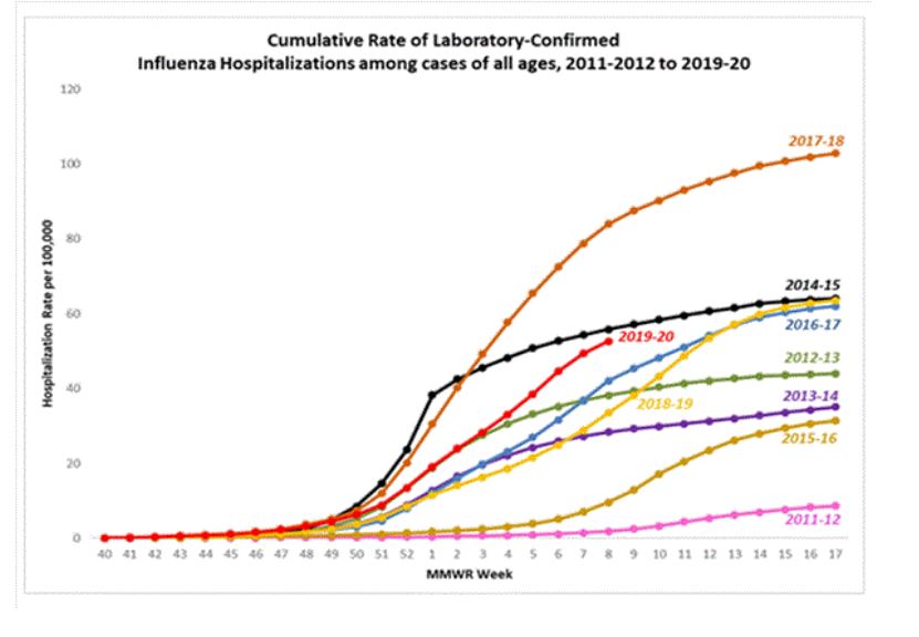 The bottom graph says inthe 2017/2018 flu season there were 100 hospitalisations (approx)for flu in the US for every 100,000 of the population, and that was a really bad year for total numbers of hospitalisations.