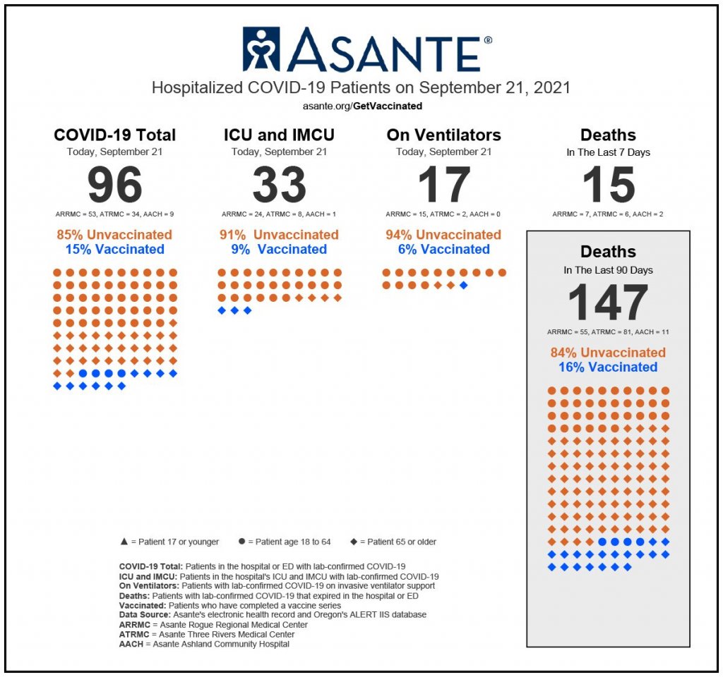 Here is today’s chart from our area’s three-hospital system in Oregon’s Jackson and Josephine counties, covering cases during the last 7 days and deaths during the last 9o days (summer). The blue triangles represent those who are over 65 and vaccinated. There were 19 vaccinated deaths in the past 90 days (about 6/month) in that age range and 4 total in the vaccinated 18-64 age range. Obviously far fewer than the unvaccinated deaths, but it is happening, tragically. This chart does not count those who die at home and a surprising number do, as our daily lists show. Nor does it count cases at the other hospital (Providence) in Medford not part of Asante.