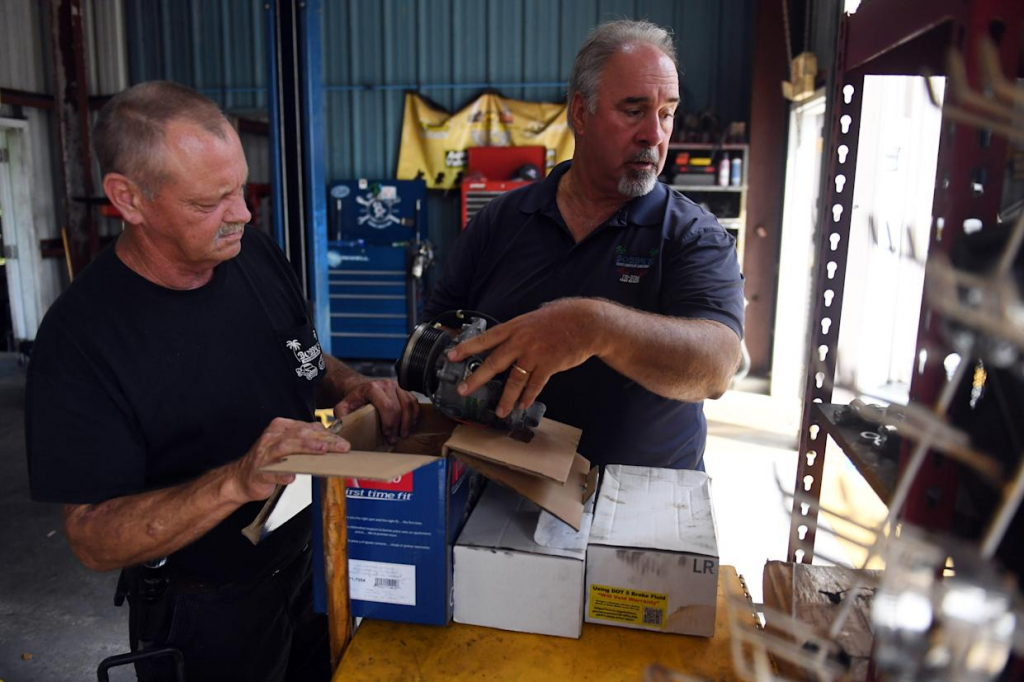 Bobby Ford (right) talks with longtime employee Dickey Millard in the service bay of Ford's shop, Bobby's Auto Service Center, on Wednesday, Sept. 1, 2021.