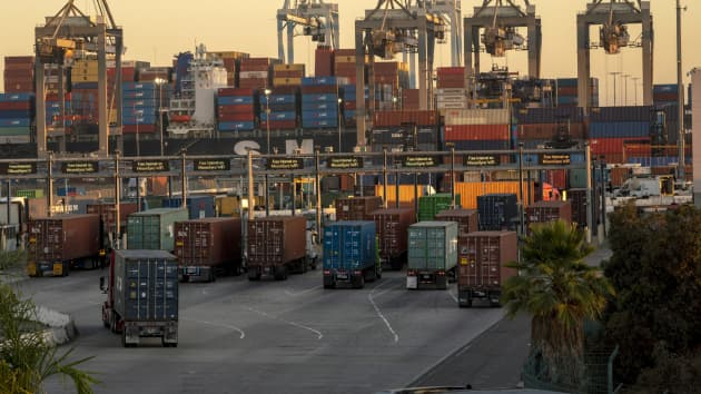 Cargo trucks parked on a barge at the Port of Los Angeles in CA.
