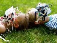 Two young children laying on the grass with their faces covered in a piles of face masks