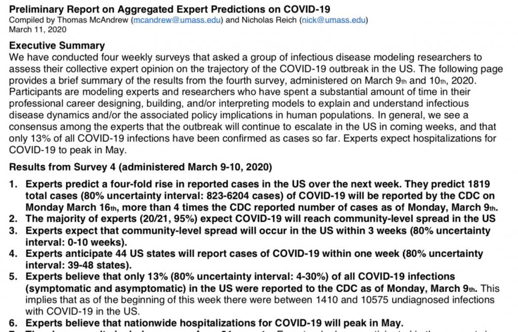 POLL average of predictions of expert epidemiologists, March 11th:4x rise in cases in the US within the next week.Community spread in Us imminent. 39-48 states will have #COVID19 in 1 week.Only 13% (4-30%) of cases will be reported to CDC.Hospitalizations peak in May https://t.co/Rd1UH6MQQE:4x rise in cases in the US within the next week.Community spread in Us imminent. 39-48 states will have #COVID19 in 1 week.Only 13% (4-30%) of cases will be reported to CDC.Hospitalizations peak in May https://t.co/Rd1UH6MQQEth:4x rise in cases in the US within the next week.Community spread in Us imminent. 39-48 states will have #COVID19 in 1 week.Only 13% (4-30%) of cases will be reported to CDC.Hospitalizations peak in May Eric Feigl-Ding on Twitter
