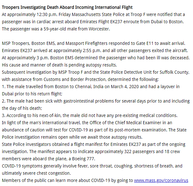 A man has died during a flight from Dubai to Boston and will be tested for coronavirus "in an abundance of caution," according to state police. He had been sick with gastrointestinal problems for several days and had no underlying health issues. BNO Newsroom on Twitter