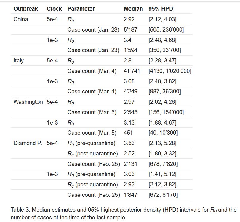 Based on results in our previous post, we are more confident in a clock rate of 5 x 10-4 compared to a faster clock. For this clock rate, we estimate the R0 (Fig. 1) for China, Italy, and Washington State (USA) to be between 2 and 4. In particular, the distributions for R0 are estimated to be very similar. For the Diamond Princess, the R0 is estimated to be between 2 and 5 up to its quarantine, and Re is a bit lower afterwards (Fig. 4). ......
